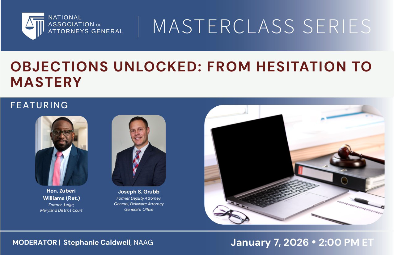 Judge Zuberi Williams, Chair of Bayard's Business ADR Practice, will serve as a speaker for the National Association of Attorneys General (NAAG) Master Class Series Webinar, Objections Unlocked: From Hesitation to Mastery. Scheduled for January 7, 2026, the webinar will explore the art of objections and provide practical guidance to help attorneys move from hesitation to confidence in the courtroom. The program will be moderated by Stephanie Caldwell, Senior Counsel at the NAAG, and will also feature Joseph Grubb, a former Deputy Attorney General and seasoned trial attorney, as a speaker.